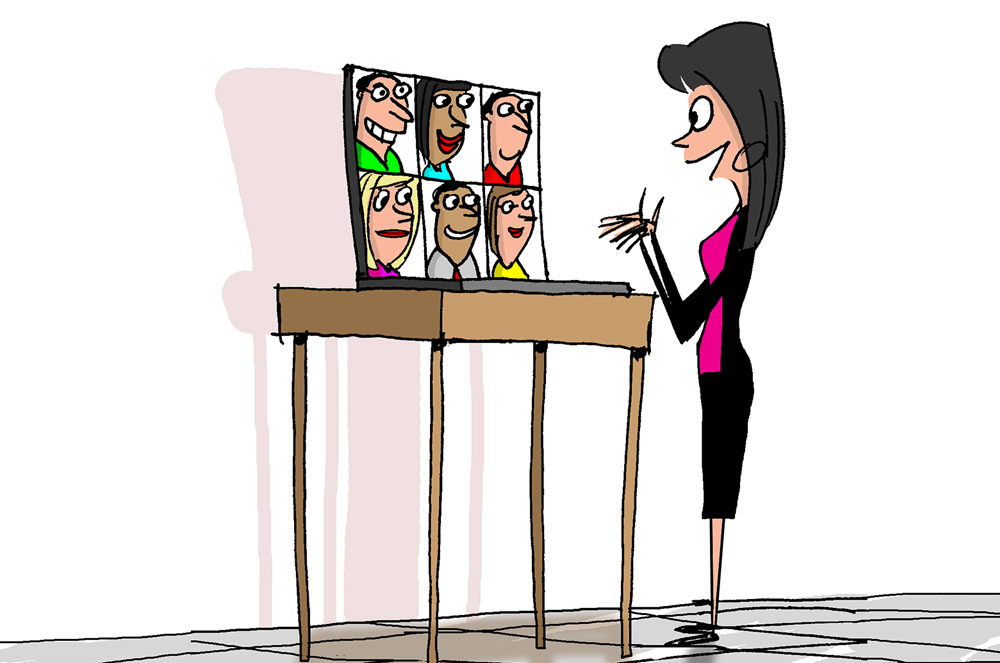Illustration of a man telling a woman to slow it down while she speaks on stage