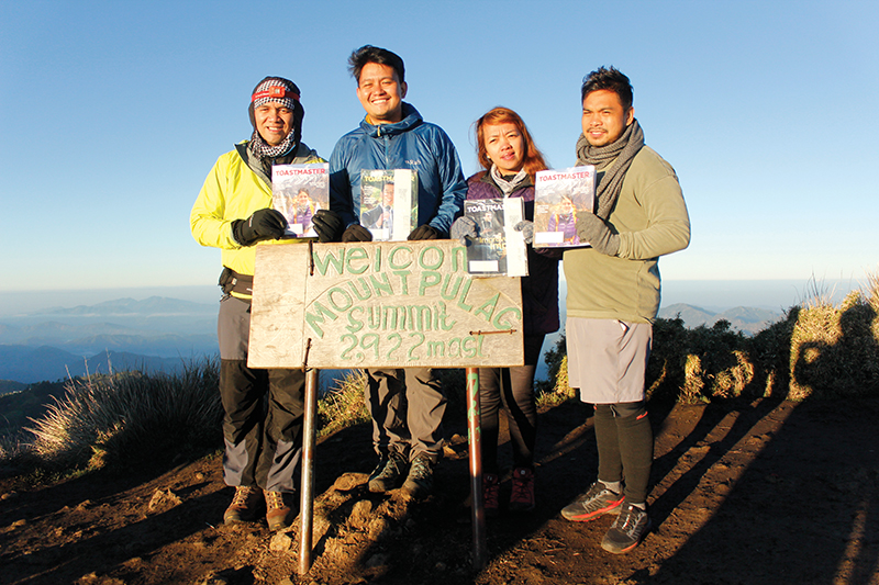 Four Toastmasters from different clubs in Cebu conquered Mount Pulag, the third-highest mountain in the Philippines, at 2,922 meters elevation. The group was formed after Jorjames R. Sajulla, ACG, ALB, (Sinulog Toastmasters club) and Daniel Perez, CC, CL, (Taipan Club) successfully climbed Mount Kinabalu, in Sabah, Malaysia, at 4,095.2 meters elevation in 2015. This was the group’s second attempt to climb Mount Pulag, and after reaching the summit they were finally able to witness the sea of clouds and beautiful sunrise. From left to right, Sajulla, Perez, Jinky Suarez (PICPA-Cebu Toastmasters club) and Dave Visaya CC, CL, (Cebu South Toastmasters club).