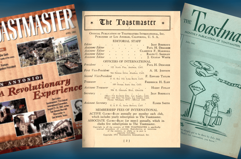 When the Toastmaster magazine debuted in April 1933—nine years after the Toastmasters organization began—it was a very modest package: less than 20 pages long, measuring only 6 inches by 3 inches, with news items about the mere 12 clubs that existed then.