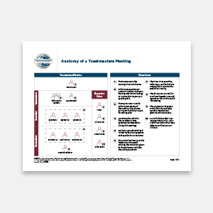 This document outlines the meeting roles used during a Toastmasters meeting. Share this one-page document with guests and new members to help them understand how a Toastmasters meeting works!