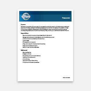 This one-page document features a summary of the Treasurer role, as well as a list of responsibilities and skills learned. Available in letter size and A4.