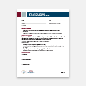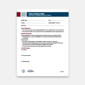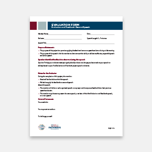 This evaluation resource is for the first speech in the “Evaluation and Feedback” project. Use it in your club to evaluate a member completing this project. You can download and complete the resource on your device, or print and complete it by hand. How you choose to complete the evaluation depends on your preference and the preference of the member you are evaluating.