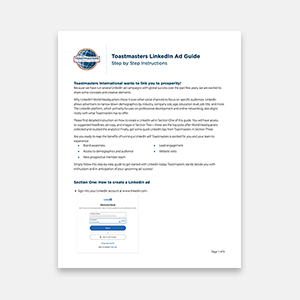 Use this how-to guide and link to ad prosperity on LinkedIn! Find detailed instruction on creating a LinkedIn ad in Section One; access suggested headlines, ad copy, and images in Section Two; get tips from Toastmasters in Section Three.