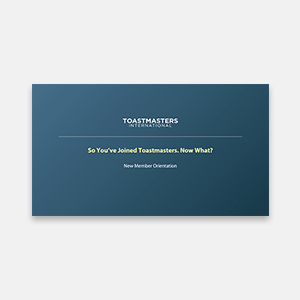 This New Member Orientation PowerPoint is the perfect way for a club officer or mentor to help a new Toastmasters get off to a strong start. In this presentation, there is information on Pathways, how to get started in Toastmasters, and is customizable for each club to outline their rules and expectations.